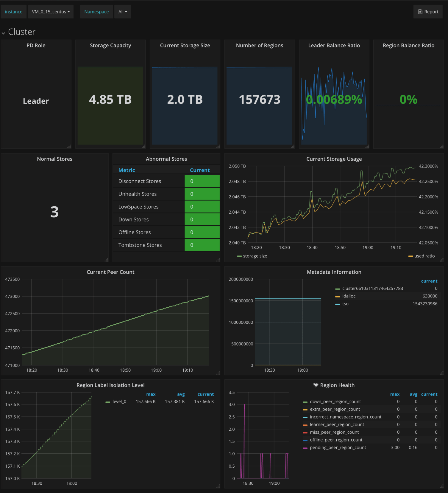 | Cluster | Region health | It records the unusual Regions' count which may include pending peers, down peers, extra peers, offline peers, missing peers, learner peers or incorrect namespaces | The number of pending peers should be less than 100. The missing peers should not be persistently greater than 0. |